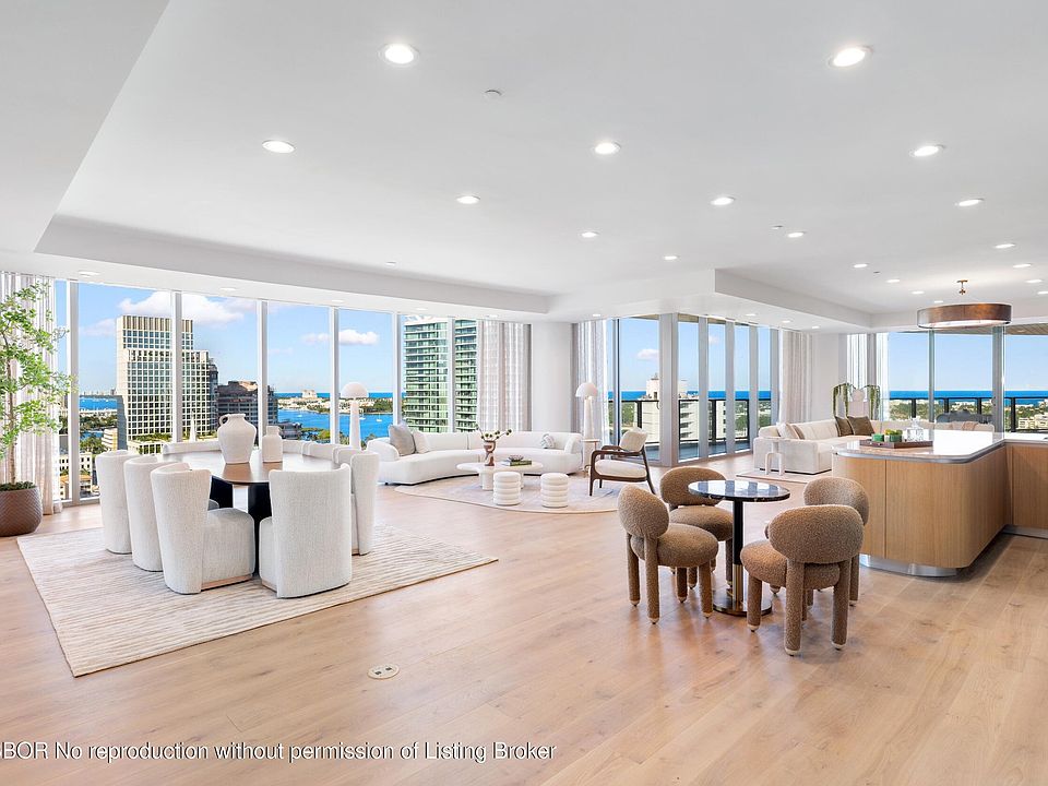 Beautiful brand new 4BR/4.1BA condominium with gorgeous Ocean, Intracoastal, and Palm Beach views. 5,400+/- total square feet of indoor and outdoor living. Private elevator foyer opens to fantastic open-concept great room. Gorgeous eat-in kitchen with chef's island. Living room features stunning water views and wet bar. Fabulous oversized terraces overlooking beautiful city views to the north and sweeping water views to the East. Waterfront Primary Suite with endless Ocean views, oversized bath, and dual walk-in closets. The iconic new Forté on Flagler building features three full floors of opulent amenities. Fantastic downtown location just blocks from CityPlace, Palm Beach Island, and so many shops and restaurants.
