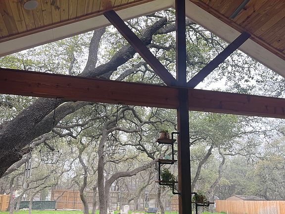 Step outside to your custom-built 450 sq. ft. patio, designed with cedar posts, a pine tongue-and-groove ceiling, and durable epoxy flooring. Surrounded by mature oak trees and a privacy fence, it's the ideal space to relax or host gatherings.