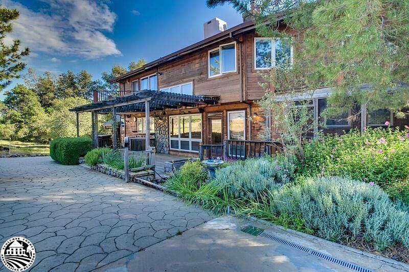 HIGH COUNTRY LODGE with wine country inspiration in the foothills of Yosemite National Park. Fly-in via Pine Mountain Lake airport or take a drive along scenic Highway 120, to the historic 49er gold rush town of Groveland at the west gate of Yosemite. Enjoy the very private 1 acre setting where this home is set back atop of a long driveway ending in a circular turn around framed by rolling meadows of ranchland. Architectural interest is demonstrated in the thoughtfully designed floor plan; warm woods and angular walls reminiscent of a fine "wine country" home. Skylights, tall vaulted ceiling, granite tiled counters, solid wood cabinets, oak flooring, formal dining and a separate breakfast area, too! Two wood burning stoves take the chill off on cool winter evenings. Prepare meals on the large kitchen work island and nearby prep sink/ counter with the pantry just around the corner or pass food through from the kitchen to the outside covered patio for fine outdoor dining. The entire upper level is dedicated as the master suite with an office, sitting area, bedroom, large walk in closet, bath-with steeping tub and separate shower-and a private deck. The enclosed "spa room" on the main level is a good place to relax at the end of the day. Entertain in the summer outside on one of the