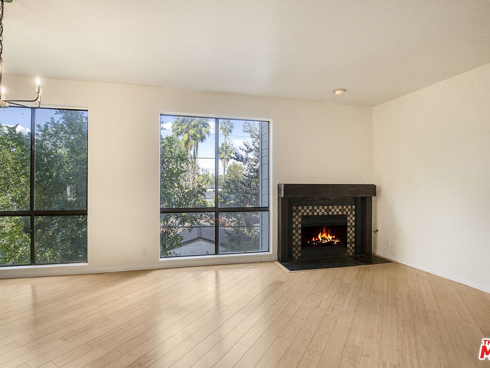 Discover unmatched value and resort-style living in this chic, single-level Sherman Village condo. As a highly desirable corner unit on the outside of the building, you'll enjoy unparalleled peace and privacy with only one shared wall and no foot traffic past your door. Step inside to an impressive open-concept floor plan, bathed in natural light, featuring elegant, recessed lighting and a cozy fireplace that anchors the living space, while treetop views from the picture windows add a serene touch. The large, well-appointed kitchen is perfect for any home chef, and you'll appreciate the ultimate convenience of in-unit laundry. Retreat to the spacious master suite, complete with a huge walk-in closet, a private patio balcony, and a fabulous ensuite bathroom. Your dedicated 2-car tandem parking space is in the subterranean garage below Building C, offering a close and incredibly convenient walk to your unit. This is truly resort-style living with its sought-after community amenities: secure entry, elevators, two sparkling pools, a relaxing spa, state-of-the-art gym, and a recreation room. HOA dues include cable, water, trash, Internet, and earthquake insurance for the building. Enjoy a premium location just walking distance to Ventura Boulevard's best shops and acclaimed restaurants and benefit from easy access to major freeways and the popular Sherman Oaks Westfield mall. Don't miss the opportunity to own this private, perfectly located gem!