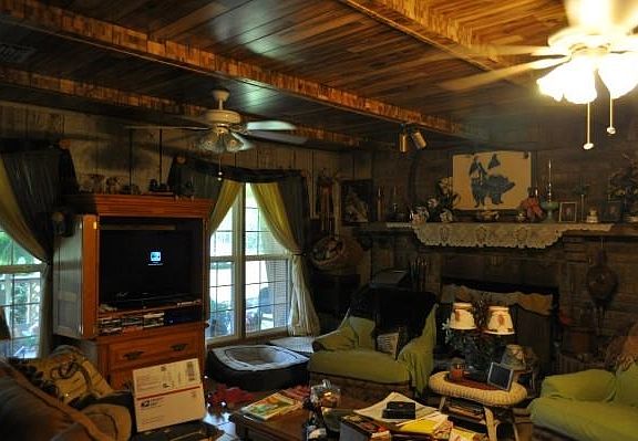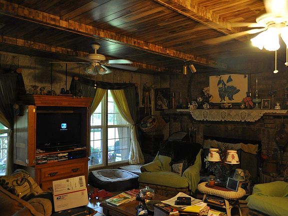 Definitely not a drive by. Nice brick home on 5.61 acres with more highway frontage than appears. Large covered front patio with lots of landscaping in front. Nice sunroom with window A/C. Large den with wood burning fireplace. Other living area and/or dining room. Wood burning stove in corner of kitchen/breakfast room. Lots of counter space and custom cabinets in kitchen. Fenced back yard. 2 Storage buildings stay. Newer A/C and roof per seller.