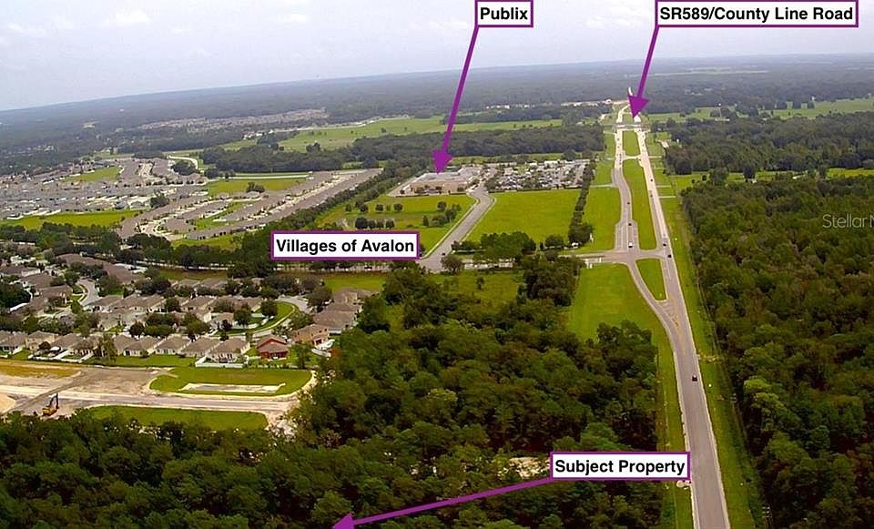 Prime commercial location, high visibility, minutes from the Suncoast Pkwy. 4.70 acres with 331 feet on CR578. Also accessible from a reverse frontage road connecting an approved community to be known as Villages of Avalon West to the existing Villages of Avalon and the Publix shopping plaza. Land Builder, LLC is in the process of rezoning the property from AG to Commercial. A copy of the Rezoning Submittal, Small Scale Comprehensive Amendment Exhibit, Rezoning / Master Plan, Conceptual plan from Coastal Engineering, Boundary Survey and other supporting documentation has been uploaded to this listing. Once the design is complete and the project is funded 85 feet of the south end of the property along with the existing structures will be relinquished under eminent domain. In the mean while the existing building (2744 sq.ft.) can be occupied or rented. At some point within the next 5 years the property owner will be well compensated for the (0.64) acres of land and the existing improvements. After allocating for the 150-foot easement (storm water basin and reverse frontage road) at the north end of the property and the 85 feet to be relinquished under eminent domain at the south end of the property, the remaining usable site area (nearly pad ready) with public water and sewer is an ample 2.89 acres. This commercial site is perfectly positioned to take advantage of the additional rooftops, traffic flow and complimentary commercial development currently underway. For additional information or to preview the site, please contact the Suncoast Team.