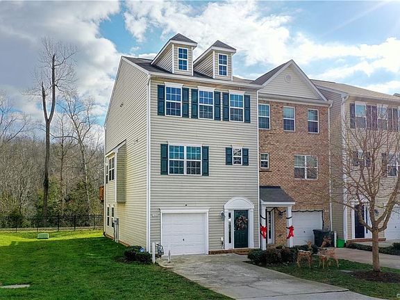 This move-in ready 3-story END UNIT Townhome has been impeccably maintained and updated! Upon entering the first floor, you will be greeted with hardwood floors, a cozy built-in 'dog room' under the stairs, Bedroom 3 with ensuite bathroom, & a direct entry 1-car garage. Upstairs, on the main living level, you will notice a large family room including a gas fireplace w/ granite surround, back door with access to rear deck which has a very private tree-filled view (nothing will ever be built behind), bamboo hardwood flooring, a separate dining area, large eat-in kitchen with island, granite countertops, tile backsplash, under cabinet lighting, & half bath. On the 3rd floor, you will find 9 ft. ceilings, the primary bedroom with ensuite bath, great laundry area, & large 2nd bedroom with ensuite bath as well. Don't miss this amazing opportunity to be within walking distance to all that is offered in the Kroger Shopping Center along with quick & easy access to Hull St and 288.