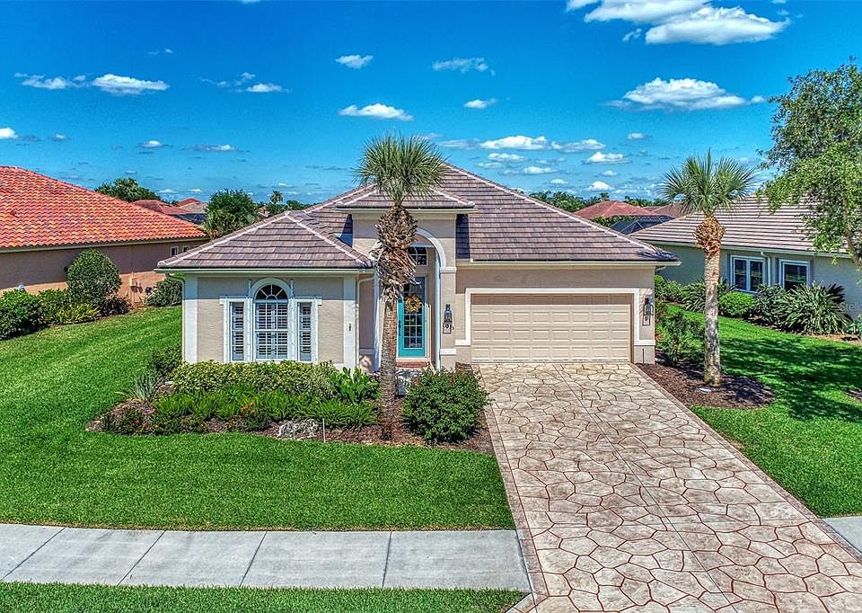 ENJOY the FLORIDA DREAM by owning this WELL BUILT and APPOINTED 2-Bedroom, 2-Bathroom plus Den (currently used as a 3rd Bedroom) home in the coveted RIVERWOOD community. Featuring a desirable upgraded Open Great Room plan, this residence offers serene views of a tranquil pond, creating the perfect backdrop for sunlit moments and relaxation. Stepping outside onto the expansive decorative engraved lanai, one will discover an inviting heated pool surrounded by ample sitting areas, ideal for soaking up the natural beauty and breathtaking sunrises. The well-designed interior of the home features architectural charm, highlighted by a grand glass front door, elegant archways in the front hallway, and soaring 10x13 ft. volume ceilings adorned with crown molding. Inside, you'll find a blend of tile and carpet flooring and tasteful interior decorative upgrades. The Kitchen is a Chef's Delight, with an expansive island, granite counters, and quality stainless steel appliances. The primary bedroom retreat features a tray ceiling, a spacious walk-in closet, and a luxurious renovated bath. Designer window treatments and lighting add a touch of sophistication throughout the home. Additional features include upgraded storm shutters on all windows and a mature landscape that enhances the property's curb appeal and privacy. Plus, enjoy the BONUS of a 2023 NEW TILE ROOF. Riverwood is a gated, golf, resort-style community that epitomizes the Florida lifestyle. Residents can take advantage of amenities such as tree-lined walking and biking paths, tennis and pickleball courts, a lap and resort entry pool, a hot tub, fitness center, and a variety of classes and social activities at the Activity Center. Recognized as an Audubon Green Community, Riverwood provides a natural habitat for Florida wildlife. For pet owners, the community offers the R.O.M.P. Dog Park, while golf enthusiasts can tee off at the Riverwood Golf Club's Par 72 Championship course or enjoy access to the Beach Club on Manasota Key. Memberships based on availability. Conveniently located between Sarasota and Fort Myers on Florida's West Coast, Riverwood offers easy access to boating, cultural events, dining, shopping, and the beautiful beaches of Southwest Florida. Contact your agent today to discover this exceptional property and start living the Riverwood Florida Lifestyle!