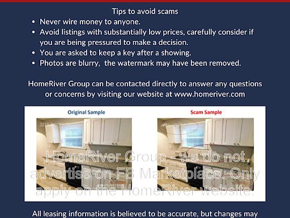 HomeRiver Group does not advertise properties on Craigslist, LetGo, or other classified ad websites. If you suspect one of our properties has been fraudulently listed on these platforms, please notify HomeRiver Group immediately. All payments related to leasing with HomeRiver Group are made exclusively through our website. We never accept wire transfers or payments via Zelle, PayPal, or Cash App. All leasing information contained herein is deemed accurate but not guaranteed. Please note that changes may have occurred since the photographs were taken. Square footage is estimated.
