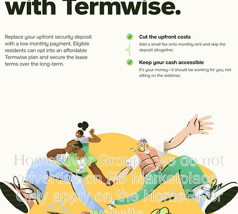 HomeRiver Group has partnered with Termwise to offer an affordable alternative to an upfront cash security deposit. Eligible residents can choose between paying an upfront security deposit or replacing it with an affordable Termwise monthly security deposit waiver fee.
