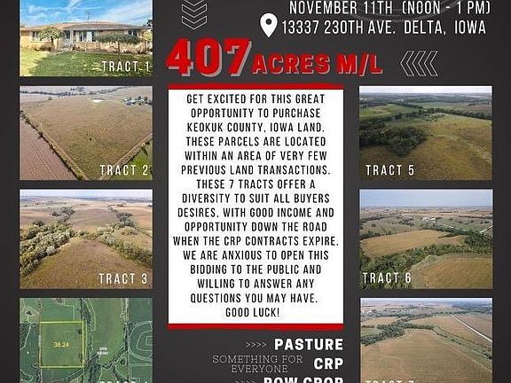 407 Acres M/L Keokuk County Iowa Online Land Auction Land will be offer in 7 tracts Surveyed acres will be posted once survey is completed. Bidding end November 21st 2023 at 11am Kenneth and Beverly Heisdorffer Trust 13337 230th St Delta Iowa Auction consists of Tillable, CRP and Pasture land as well as a country residence with outbuildings and pond.