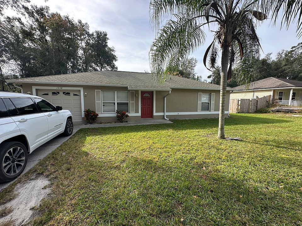 Clean home with vaulted ceilings and inside laundry and a fenced yard, includes lawn service.