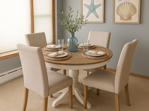 This spacious unit welcomes you with an inviting eat-in kitchen and a combined living/dining room that opens into a den or home office, complete with a cozy gas fireplace — a perfect spot for chilly evenings. This flexible space could also serve as a main-floor bedroom. The main level also features a ½ bath and a peaceful screened-in porch to enjoy lakeside breezes.
