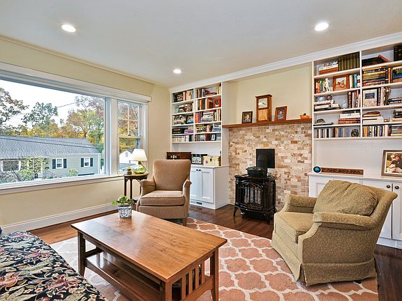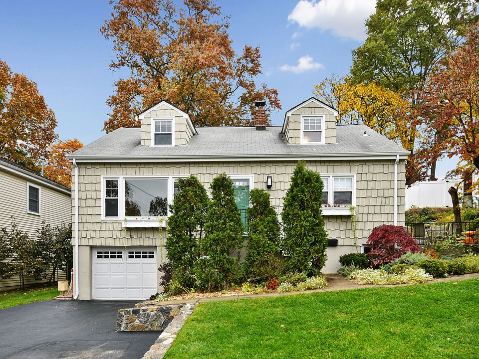 Beautifully maintained expanded Cape Cod offers three bedrooms, two full baths, spacious living room with great natural light and a Napoleon direct vent Gas Stove with battery starter. The dining room leads to a renovated hall bath and to a modern dine-in kitchen/family room including a large Island with plenty of storage, Cherry cabinets, tile floors, granite counter tops and the efficiency of the Adorne under-cabinet lighting and power system by Legrand. Sliding door to the patio leads to a fenced private back yard with a mature landscaped garden. The second floor offers two spacious bedrooms, hall bath and storage. The basement has a laundry room, unfinished room currently used as a playroom. There is a large garage. Central air and hardwood floors. Additional improvements: Hot water heater, refrigerator (2018), new kitchen, exterior paint and lighting, stone wall along driveway and clothes dryer (2016), center staircase (2015), garage door and motor (2013).