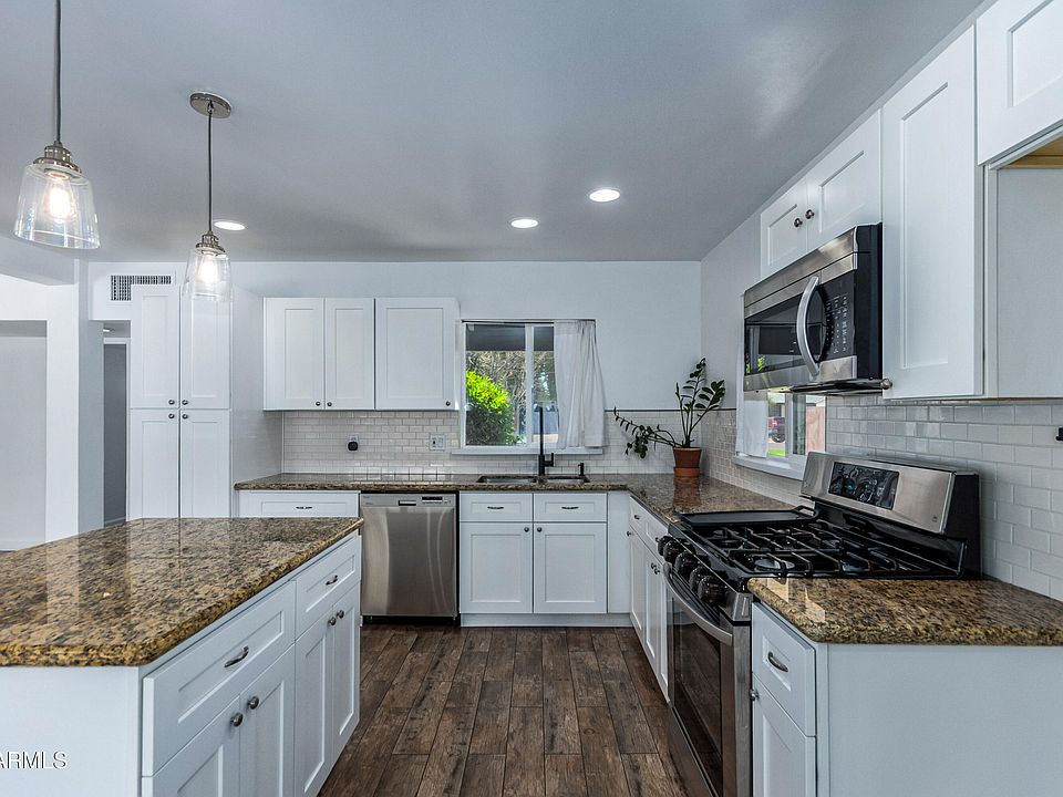 Discover this beautifully updated 3-bedroom, with no HOA, located on a quiet street in the heart of Phoenix. Inside, you'll find a spacious open-concept layout with a neutral color palette, recessed lighting, plantation shutters, and durable wood-look tile flooring throughout. A striking stone-clad fireplace anchors the living room, perfect for cozy evenings.