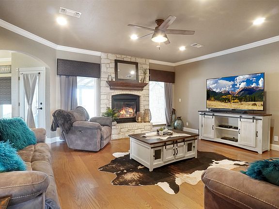 Beautiful 4-bedroom, 4.5-bathroom home on 10 acres in a prime location near HWY 114 and I-35. This property features an open floor plan with hardwood floors, a stone indoor fireplace, and large windows for natural light. The gourmet kitchen offers Jenn-Air stainless steel appliances, center island, breakfast bar, and custom cabinetry. The primary suite includes a spacious bedroom, double vanity, soaking tub, and walk-in shower. Two upstairs bedrooms are ensuite, ideal for guests or family.