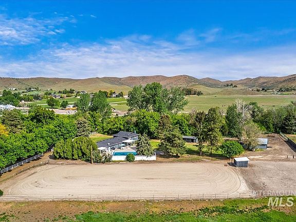 Discover a fantastic 5-acre horse property that combines the charm of rural living with potential income opportunities. This property features a large updated home with 684 sq ft separate living quarters offering flexibility for guests, office or potential rental income. New roof in 2022 with a transferable warranty, new A/C and water heater among many other upgrades. Large in-ground pool, horse barn equipped with stalls and tack room, round pen, wash racks, and a dressage full court arena, catering to all your equestrian needs. An abundance of space for RV, toys, equipment in addition to a small animal barn and garden area. Seasonal creek enhances the property's natural beauty and provides a peaceful ambiance. Surrounded by beautiful mountain views and a serene landscape with a seasonal creek, this property is perfect for living on acreage with potential development opportunities, close to city of Eagle conveniences.