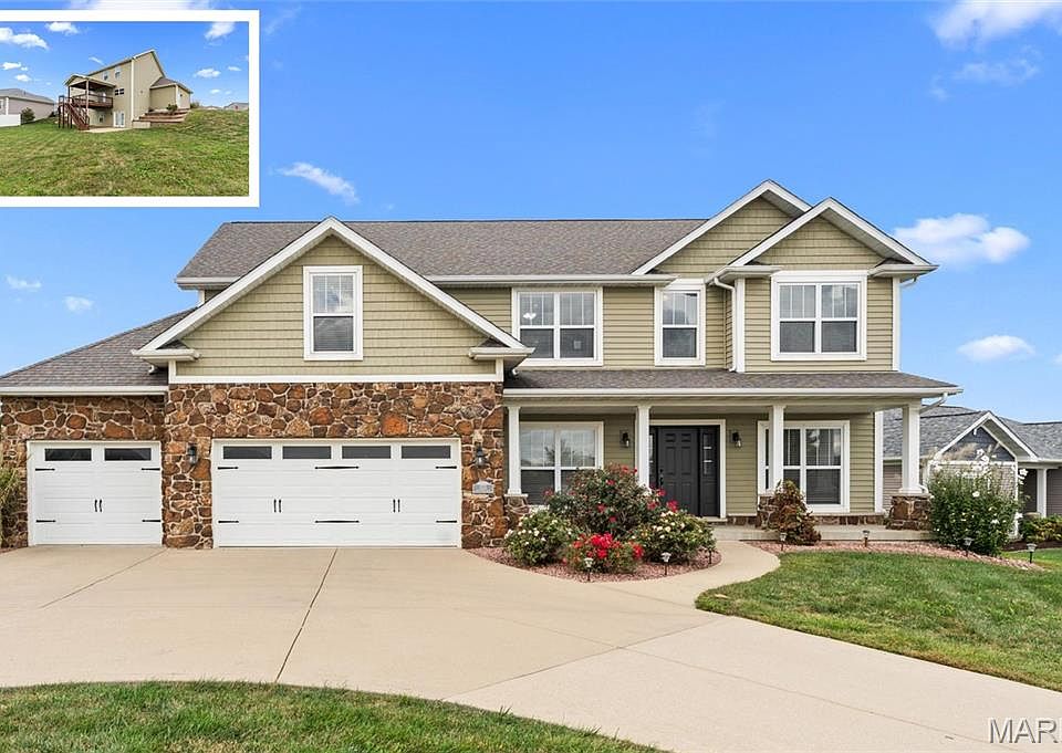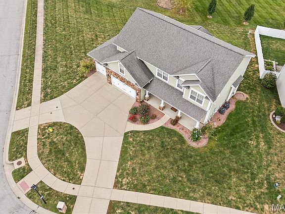 Welcome home to this stunning custom two-story residence in Parcs at Arbor Green! Perfectly positioned on a corner lot with a circular drive, this home offers impressive curb appeal and exceptional space inside and out. The main level features a spacious home office with French doors and a formal dining room flanking the foyer. The light-filled family room with a cozy gas fireplace opens seamlessly to the updated kitchen, showcasing a large island with storage, stainless steel appliances including a glass cooktop and wall ovens, and plenty of cabinet space. The breakfast room leads to a covered deck overlooking the expansive backyard—ideal for relaxing or entertaining. Upstairs, you’ll find a versatile loft area, perfect for a second office, media space, or playroom. The luxurious primary suite boasts dual walk-in closets and a spa-inspired bath with a soaking tub, walk-in shower, and dual vanities. Three additional bedrooms upstairs are generously sized and offer excellent storage. Convenient upper level laundry room. The finished walkout basement provides a fantastic setup for extended family or guests, featuring a large recreation room, kitchenette with full-size fridge and cooktop, a fifth bedroom, full bath, and plenty of storage. Conveniently located near Scott AFB, I-64, O’Fallon’s Sports Park, shopping, and dining—this home truly has it all!