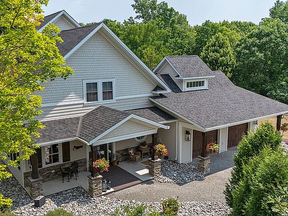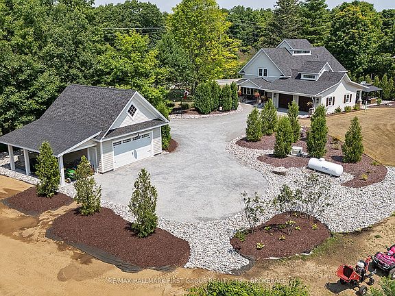 A very rare find, this exceptional custom-built home is nestled on a pristine 18-acre parcel offering private woodland trails, expansive landscaped grounds, and an unmatched standard of quality throughout. From the moment you arrive, you'll feel the sense of care and craftsmanship that defines this stunning property. Designed with both elegance and comfort in mind, the spacious layout is highlighted by a warm, welcoming main floor family room featuring a statement flame fireplace. The heart of the home is a beautiful custom kitchen complete with large granite island, custom built-ins, built-in buffet, and formal dining room perfect for everyday living or entertaining guests in style. Coffered and custom ceilings add character throughout the home, while a neutral palette offers timeless sophistication. Step outside to relax under the covered pergola, surrounded by meticulous landscaping that blends seamlessly with the natural beauty of the land. Upstairs, you'll find vaulted ceilings with skylights that flood the space with natural light. All three bedrooms are generously sized and offer walk-in closets and the primary bedroom features a spa-like ensuite with a glass-enclosed shower and soaker tub. Designed with comfort and quality in mind, this home has radiant in-floor heating on all levels with individual zone control, central air and HRV system all topped off by a built in Cummins generator in the event of power outage. Attached 2-car garage with inside entry is heated and insulated. Additional 2 car detached garage/workshop with lean-to for storing your toys or equipment is fully wired and ready to go - perfect for hobbyists and DIYers alike. If quality and craftsmanship are what you're looking for in your next home this may be the perfect opportunity for you.