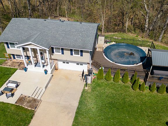 Summer in the country is delightful! Come see this spacious 4 BR, 3 bath home on 1.31 acres with newer 24' round pool with deck and pool shed, plus a Viking hot tub (2018) with roof that keeps out leaves. Go hiking in the timber or sit around the back yard fire pit toasting marshmallows on cool fall evenings. This home is move-in ready featuring kitchen with granite countertops, stainless steel appliances, and new dishwasher. Home has new carpet, updated master bath, hall bath, and even a 3rd bathroom on the lower level! No more waiting in line to use a bathroom!! In addition, there are 2 outdoor sheds that stay, a new concrete front patio area, new septic pump & motor 2023, radon mitigation system with new fan, a $5000 Kinetico Water Purification System with soft water, plus a heated/cooled garage. So don't delay--come see today if this is the place for you to call home!