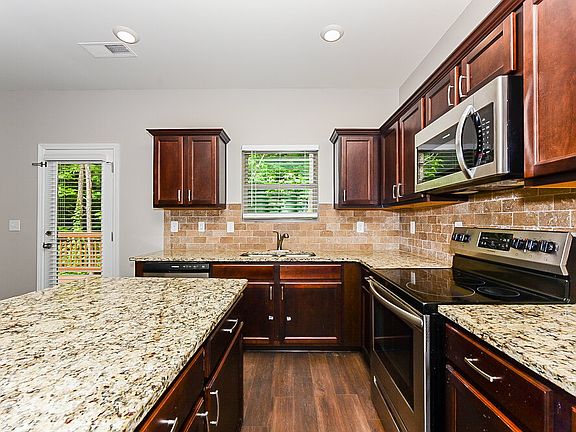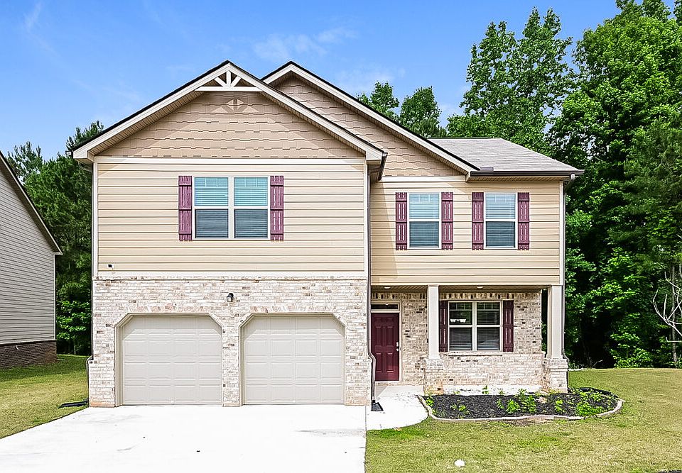 Set against a backdrop of towering green trees, this rental home with four bedrooms and two and a half bathrooms in Locust Grove has a two-car garage and lovely crimson accents on the exterior windows. A wooden ceiling fan, a glossy black fireplace, and blinded windows with a view of the lush backyard give the living room elegance. Walk into an open kitchen with a wide French-door refrigerator, a beautiful central island for recipe preparation, wooden cabinets with a stainless steel range set, and a streamlined pantry. Upstairs, the carpeted master bedroom features an attached bathroom with tiled flooring, a walk-in shower with a stylish glass door, dual vanity sinks, and an expansive closet at the back. Grab your opportunity to rent this amazing home ASAP!