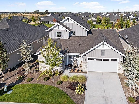 HUGE PRICE DROP!OWNERS FOUND NEW HOME! Resort-style living in this stunning 4-bedroom, 3-bath home with access to incredible HOA amenities, including a golf course, three pools, miles of manicured walking paths, tennis and pickleball courts, soccer field, and multiple playgrounds. The front porch overlooks a peaceful, fishable pond and offers breathtaking views of Bogus Basin. Inside, the contemporary kitchen features Whirlpool appliances, a large island, and plenty of counter space, flowing into the dining area and great room with a cozy fireplace. Pet-friendly LVP floors run throughout the main living spaces. The primary suite includes a spacious tile shower, dual vanity, and walk-in closet, with a secondary bedroom, full bath, and laundry room on the main floor. Upgrades include electric blinds above the stairwell, invisible screen doors, and a 3-car garage with an epoxy floor and heater. Outdoors, enjoy the large covered patio, no rear neighbors, and an electric dog fence in the front and back yards.