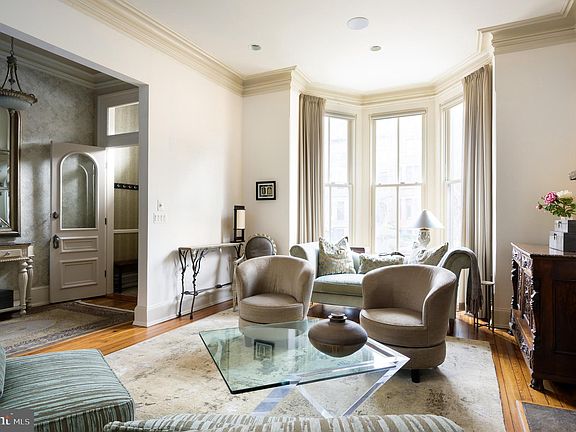 Just 350 feet to Logan Circle, 1335 Vermont Avenue NW occupies one of Washington’s most coveted locations. A quintessential red brick row home originally built at the end of the 19th century, the residence has been painstakingly transformed into a poster child for modern luxury while preserving every ounce of its history, pedigree, and character. Set far back from the street behind a wide sidewalk, a wrought iron gate opens into the home’s front garden. A tranquil, manicured patch, it augments the already significant curb appeal. At the top of a set of stairs is a set of double doors lacquered in a rich glossy green, parting ways to reveal a dedicated vestibule lined in intricate marble mosaic and illuminated via natural light from the transom window above. A second set of double doors opens into the foyer, a traditional space spanning nearly the home’s entire depth with the gracious staircase offset to one side. Adjacent is the formal living room, an embassy-sized space bathed in natural light from the bay window overlooking the front lawn. Thick crown molding and a roaring fireplace with a substantial stone surround accents the room. An effortless flow characterizes the transition into the formal dining room, an ornate space richly appointed with a gleaming crystal chandelier, deep turquoise paint, and a large framed mirror above the second stone fireplace. The main level’s soaring ceilings are evident in the dining room, and an integrated surround sound system carries through both formal spaces. Completed the main level is the kitchen at the rear of the home. Efficiently laid out and intricately detailed, its dark beaded cabinets are complemented by dark granite countertops, gorgeous custom pulls, a copper mosaic backsplash, and inlaid marble floors. A powerful yet compact commercial-grade BlueStar range is to appease any chef. The kitchen offers direct access to the large, private, double-tiered rear terrace – a true luxury within the urban core. On the upper level, the primary suite overlooks the front lawn and streetscape beyond. Ten-foot ceilings, dual closets, and a sumptuous primary bath evoking a slight coastal flavor with its turquoise marble feature wall establish the room as a well-designed sanctuary. The second bedroom is ample in scale and served by a dedicated hall bath, clad in Carrara marble with inlaid floors, glass shower, and separate soaking tub. The lower level can be directly accessed from the rear terrace. Centrally located is the large family room, featuring an additional fireplace and providing a generous recreation space for large gatherings. Comprehensively livable, tastefully luxurious, and situated in a truly unparalleled Logan Circle location, 1335 Vermont Avenue NW is one of the region’s hidden gems of historic architecture.