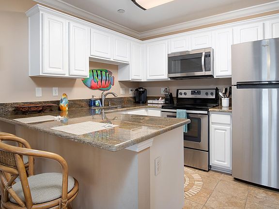 It offers a fully-equipped kitchen with a bar dining area: prepare a culinary masterpiece in the gourmet kitchen, boasting updated appliances, beautiful granite countertops, plenty of cabinet space, and all the small appliances, utensils and cookware needed to whip up a delicious meal!