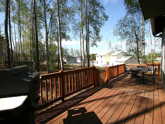 BETTER THAN NEW! Quality Thomas Company home completed in August 2005, this home is the best value in the neighborhood. Nestled in a family friendly cul de sac in the popular Powder Ridge neighborhood, this house features a grand 14ft foyer with upgraded chandelier and tile floor. Contemporary open-concept main floor features durable wood laminate flooring and custom tile. Two-story great room is wired for surround sound and features vaulted ceilings, upgraded ceiling fan, tile-surround gas fireplace and a wall of windows providing abundant natural light. Great room leads to dining area which flows into gourmet kitchen featuring upgraded cabinets with under-cabinet lighting, granite slab counter tops and island, matching stainless steel appliances and a corner window over the sink. First floor bedroom has vaulted ceiling, double French doors and makes a great office. A half-bath completes the main floor. Angled staircase leads to two additional family bedrooms, a full bath and the master suite. Master bedroom has vaulted ceiling and master bath features large corner Jacuzzi brand jetted tub with tile surround and separate shower, double vanity with custom framed mirror, large corner glass block windows and walk-in closet. All rooms fitted with custom cellular black out blinds. Oversized three-car garage with 12ft ceiling provide plenty of storage for your Alaska toys. Driveway professionally sealed June 2009. Large back deck comes with integrated outdoor speakers and overlooks wooded backyard. Lot is adjacent to a large, landscaped easement that is maintained by the development. It's flat, open terrain is perfect for that impromptu touch football game, stringing up the volleyball net, or letting the kids or the dogs run around. Convenient to Fred Meyer and downtown Eagle River with easy access to the Glenn Hwy allowing for an easy, hassle-free commute to bases, Anchorage and the Valley, this well maintained, smoke-free, pet-free, meticulously maintained home is in "turn key" condition and ready for entertaining. More pictures on militarybyowner.com, www.fsboalaska.com, and www.owners.com/APG0083. Come join us for an open house Saturday and Sunday, July 11 and 12 from CANCELLED. Contact owners for any questions or to schedule a showing during the week. Thanks for looking and have a great weekend! Neighborhood Description We chose Powder Ridge because it is a safe, quiet, family-friendly neighborhood of newer, well-maintained homes that is convenient to shops and grocery stores in downtown Eagle River with extremely easy access to the Glen Highway for both work and the conveniences of Wasilla and Anchorage.