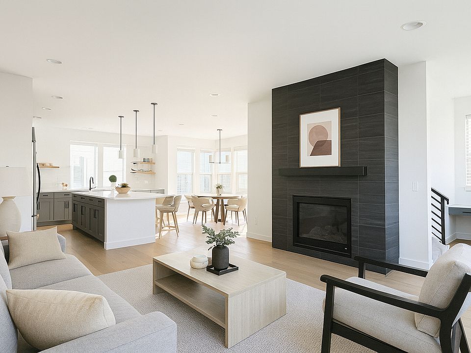 Main Level: Open living and dining areas with elegant engineered hardwood floors, plus a gourmet kitchen featuring quartz countertops, a large island, and premium JennAir stainless steel appliances perfect for entertaining or everyday living.