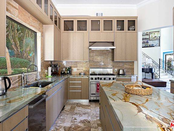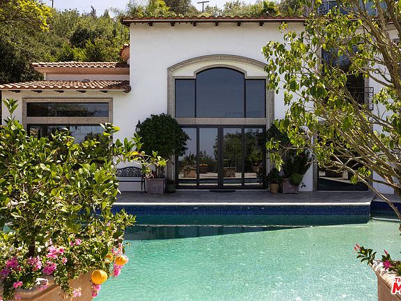 Set in a private hillside setting, this Mediterranean-inspired estate balances timeless architecture with refined 2023 renovations. A gated drive leads to a sweeping motor court framed by mature landscaping, a covered carport, and multiple garages, setting the stage for both grandeur and privacy. Inside, natural light pours through all-new Pella windows and doors, highlighting reimagined interiors. The main and upper levels were extensively remodeled, including a complete transformation of the kitchen and bar, spa-like bathroom renovations, and new upper-level flooring, bringing a fresh sense of sophistication to every space. Grand entertaining rooms with soaring ceilings and a wrought-iron staircase transition seamlessly outdoors, while a lounge and custom bar connect directly to the pool terrace. The chef's kitchen showcases striking stone surfaces, custom cabinetry, and professional-grade appliances, paired with a breakfast nook overlooking the gardens. Additional living spaces include a family room, gym, office, and a media room with theater-style projection. Seven bedrooms provide comfort and scale, anchored by a serene primary suite with fireplace, spa-inspired bath, dual vanities, soaking tub, and private balcony. Resort-style amenities include a temperature-controlled wine cellar, wood-lined sauna, versatile game and lounge areas, and fluid indoor outdoor living. The backyard is a private sanctuary with a shimmering pool, shaded cabanas, expansive patios, and vibrant gardens. This estate may be purchased separately or together with the neighboring parcel at 13345 Mulholland Drive (MLS #: 25591609), a rare scale for the area and an extraordinary canvas for a private compound. Minutes from the city yet worlds away in ambiance, this residence offers tranquility, versatility, and a lifestyle equally suited for entertaining or everyday living.