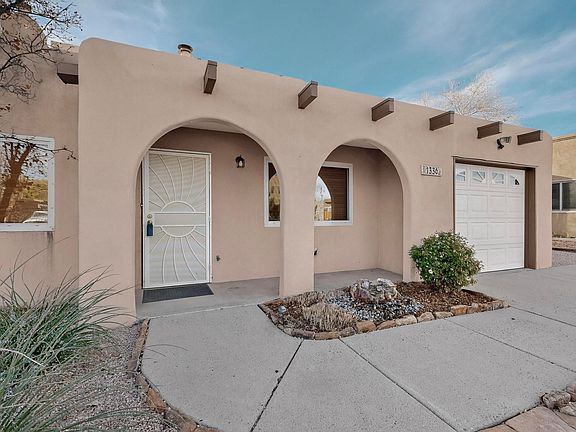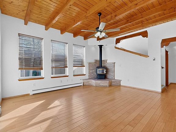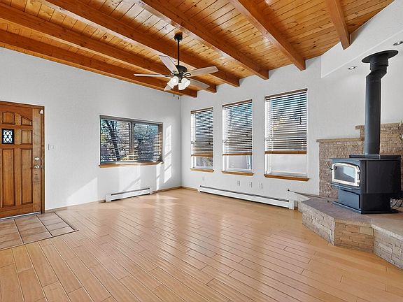 This home is filled with abundant natural light, creating a warm and inviting atmosphere throughout, making it a truly exceptional place you'll want to call your own. This property features 3 bedrooms PLUS an office. 2 full bathrooms, each with custom cabinets, beautifully tiled bathtubs and granite countertops. The living room boasts a cozy wood stove and high beamed tongue-and-groove ceilings, adding Santa Fe charm to the home. Retreat to the main bedroom suite, which offers its own fireplace and a private balcony with a mountain top view—ideal for unwinding after a long day. The kitchen is complete with a brand-new gas stove/oven, custom-made cabinets, granite countertops and tile backsplash. Step outside to enjoy the fully landscaped front and back yards, featuring tranquil water fountains and mature landscaping maintained with drip irrigation. The backyard also includes a flagstone covered portal, perfect for outdoor entertaining and relaxation. Home includes a one car finished garage, large storage shed and a laundry room with a large basin sink and ample upper cabinets. Tiled and wood flooring adds the extra touch.