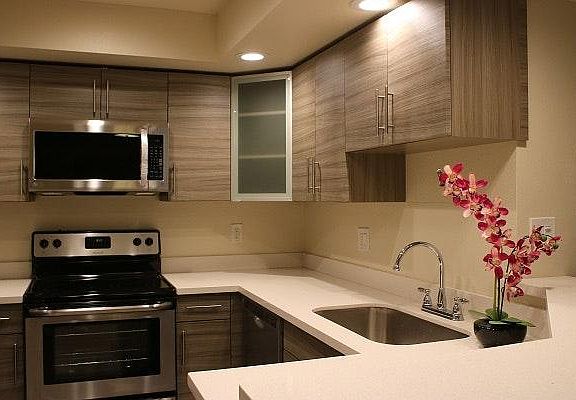 Kitchen with high-end cabinets, quartz countertop, Stainless Steel appliances, high-end vinyl floor.