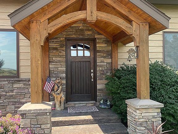 Rustic wooden beamHot tubWater rightsLarge garden areaCustom woodworkWell-established landscapingSmall irrigation ditch