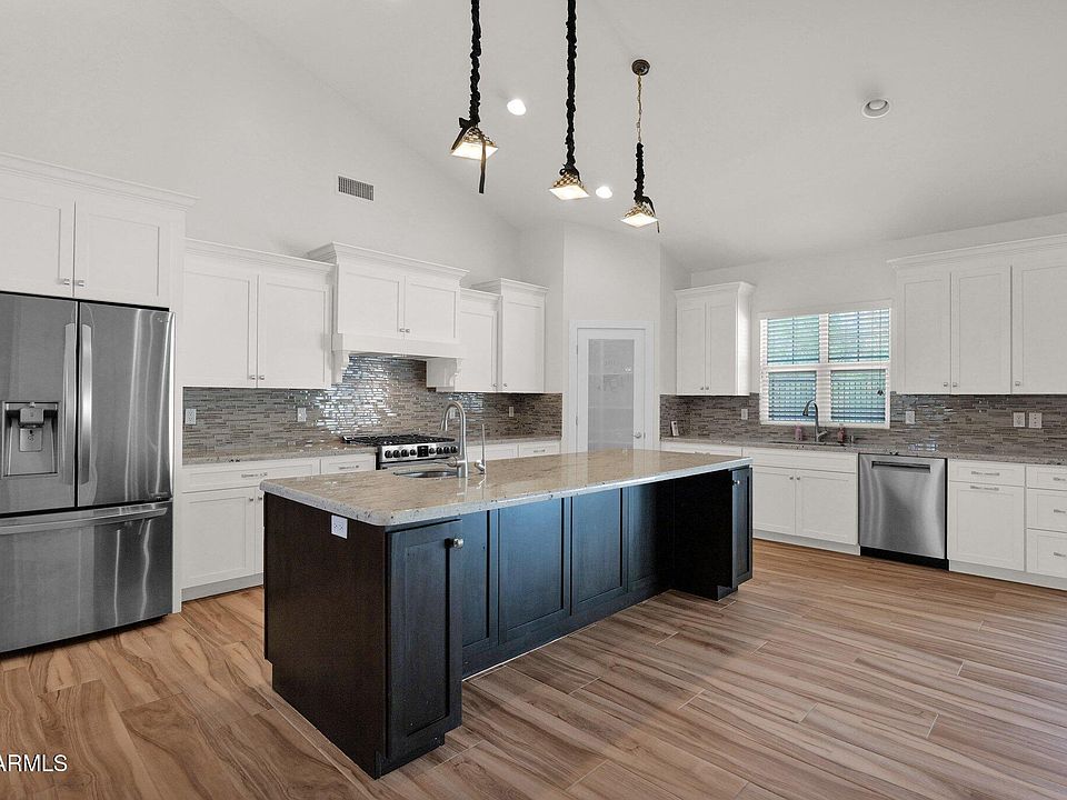 Vaulted ceilings and an open floor plan enhance the home's bright and inviting atmosphere. The modern kitchen is equipped with sleek stainless-steel appliances and ample counter space for entertaining.