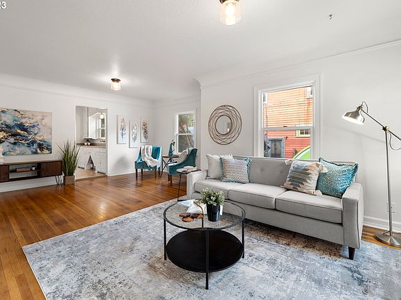 English Cottage in Kenton with easy access to freeway, grocery shopping, shops, restaurants, coffee shops, light-rail, parks! Amazing floor plan - functional, flexible and stylish. Den/office area, living room, dining room, kitchen w/"Corian" style smooth surface counters and potential for a eating nook. Main floor bedroom and bath. Upstairs includes a 2nd full bath and 2 large bedrooms with high vaulted ceilings, cork floors and windows that provide views peeking into the trees. "To period" hex-tile floors and subway tiles in both full bathrooms. All hardwood /cork / tile / hard surface floors throughout. Local artisan crafted iron railing upper level. All appliances. "Catio" with little stairs from the basement to the side yard. The basement is mostly unfinished and has higher ceilings, storage room and washer / dryer / utility sink. Detached 1 car (oversized) garage. Radon mitigation system in place. The yard is ready for your green thumb to recreate and cultivate the timeless English gardens. Mature, hearty plants including the all time favorite, Wisteria, are already in place! [Home Energy Score = 1. HES Report at https://rpt.greenbuildingregistry.com/hes/OR10215483]