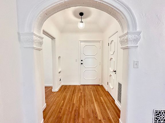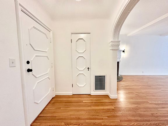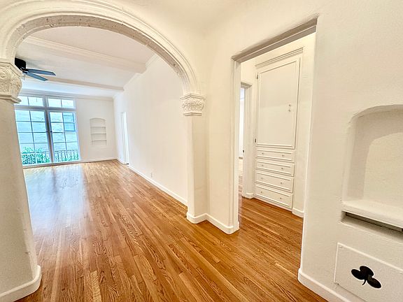 Listed in the National Register of Historic Places, West Hollywood's Harper House was designed by renowned architect Leland Bryant in 1929. This elegant Spanish-style courtyard complex currently has a large, must-see 2nd-floor one-bedroom, one-bathroom unit available. Gorgeous one-bedroom unit with beautiful vintage details. The entry features a spacious foyer with a coat closet, leading into a grand main living room with an ornate decorative fireplace, arched details, crown molding, and French windows. Hardwood flooring runs throughout the living room, hallway, and bedroom. The separate kitchen is bright and inviting, featuring classic black-and-white checkerboard flooring, new quartz countertops, stainless steel appliances, and ample cabinet space. Large windows fill the space with natural light and overlook lush greenery. Just off the kitchen is a cozy breakfast nook, perfect for a small table or coffee corner. The hallway offers built-in storage cabinets and drawers, leading to the bathroom, which has vintage charm with hex-tile flooring, a pedestal sink, a separate tub and shower, and two bright windows. The bedroom is spacious and serene, featuring modern wall sconces, a large window with leafy views, and a closet with built-in drawers and mirrored door. Enjoy the beautiful central courtyard with a peaceful pond and lush landscaping, capturing the timeless character of this historic property. Attached garage parking for ONE (1) car ONLY. Laundry on site. Elevator Access. Well behaved small pet okay, restrictions apply. Fabulous WeHo location! Walk to grocery stores, restaurants, shops, gyms and fitness studios, entertainment, bars and clubs! Professionally managed by Crescent Management. This property is shown by appointment only. To schedule a viewing, please text/call Ari with Crescent Management between 9 am and 5 pm. One year initial lease term; month-to-month following initial one-year term. Tenant responsible for Gas, Electricity, Cable/Internet/Phone. No Smoking. One (1) assigned parking space included in monthly rent