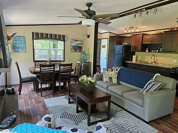 Discover one of the most spacious and private retreats in Lantern Bay! This 900+ sq ft, 3-bedroom, 2-bathroom cottage is designed for comfort and relaxation. Inside, enjoy an open-concept living area with a fully-equipped kitchen, plus a queen bedroom with an ensuite bath and two additional bedrooms each featuring double/single bunk beds with convenient storage and a shared bathroom. Step outside to a wrap-around deck perfect for soaking up the fresh air, with two charming gazebos and a cozy fire pit for evening gatherings. A quick 5-7 minute walk takes you to the beach, marina, pools, and community areas where you can make the most of resort living—swim in one of the two pools, join friends at the community hub, or enjoy friendly games at the sports court and horseshoe pits. From sunset marshmallow roasting by the fire to sunny days on the sandy beach, this cottage offers a perfect mix of relaxation and adventure. The all-inclusive seasonal fee of $9,925 + HST covers everything you need for worry-free enjoyment, including resort activities, amenities, lot rental, hydro, water, sewer, and lawn care. Only propane and internet costs remain, and HST does not apply to the sale. Make this cottage your go-to retreat for family, friends, and lasting memories.
