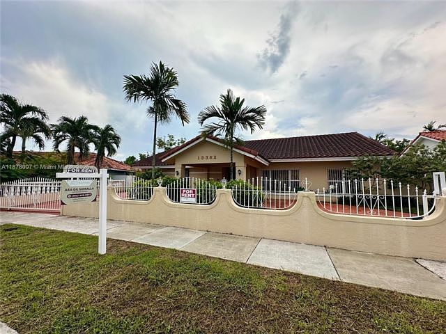 Beautiful, one-story, oversized single-family home for rent (2,105 sq. ft living area and 7,708 sq. ft. lot), located at a very quiet street. The property is comprised of 3 bedrooms, 2 bathrooms, enclosed terrace, separate laundry room, huge backyard with outdoor kitchen. There is a separate back structure, encompassing half bathroom and a storage room. Kitchen and bathrooms are not updated. Plenty of parking space, circular driveway. All fenced. No HOA approval required.