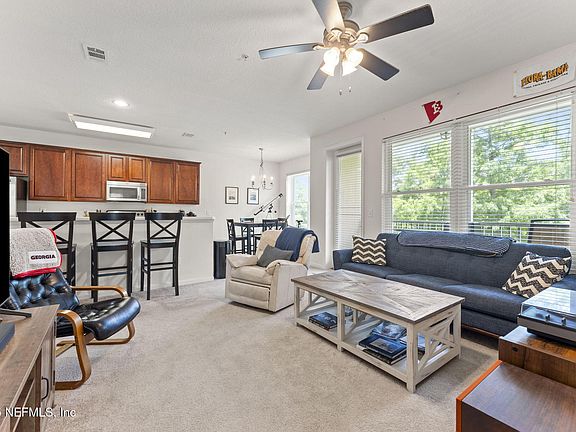 Enjoy carefree condo living in this immaculate second-floor unit with elevator access in the sought-after gated community of Wolf Creek. This spacious 3BR/2BA home features an open-concept layout with abundant natural light, fresh paint, in-unit washer/dryer, and ceiling fans in every room. The large primary suite offers an ensuite bath with dual vanities, walk-in shower, and generous closet. Two additional bedrooms share a full bath. Relax on the private screened balcony with serene pond views. Enjoy resort-style amenities: pool, fitness center, car wash, and clubhouse. A pedestrian gate offers easy access to nearby shopping and dining. Ideal location- conveniently located near Mayport, St. Johns Town Center, Mayo Clinic, and pristine beaches!