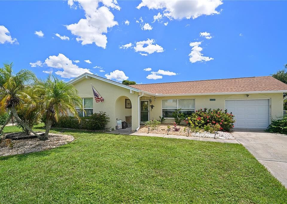 Welcome to this charming 2-bedroom, 2-bath home offering 1,052 square feet of thoughtfully designed living space and a PRIVATE heated in-ground pool. A paved driveway and lush landscaping create an inviting first impression, while vaulted ceilings and a bright, functional layout enhance the interior’s airy feel. The kitchen is beautifully appointed with stainless steel appliances, granite countertops, a tile backsplash, and abundant soft-close cabinetry. Tile floors flow throughout the home for easy care and a clean, modern look. The spacious primary suite features its own en-suite bath, providing comfort and privacy. Step outside to your personal retreat: a large screened lanai with pool surrounded by tropical palms, an outdoor shower, a fenced backyard, and additional patio space perfect for entertaining or relaxing. The home also includes a 1-car attached garage, an additional gravel drive for RV parking, impact windows, a newer roof, and a well for irrigation. Located in the desirable Gardens of Gulf Cove, this neighborhood offers low annual HOA dues of just $470 and fantastic amenities including a clubhouse, library, basketball court, fitness center, pool table, ping pong, air hockey, and more. Just minutes away, enjoy some of the best Gulf Coast beaches at Manasota Key, Lemon Bay, and Gasparilla Island, plus abundant shopping, dining, and the Charlotte Sports Park—home to the Tampa Bay Rays spring training. Don’t wait—homes with a private pool and this location rarely last long. Call now to make it yours!
