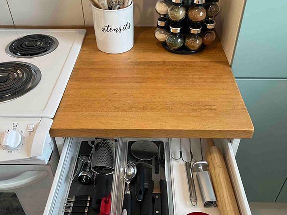 Laundry: The unit has a full-sized washer and dryer in a closet that also offers additional storage.