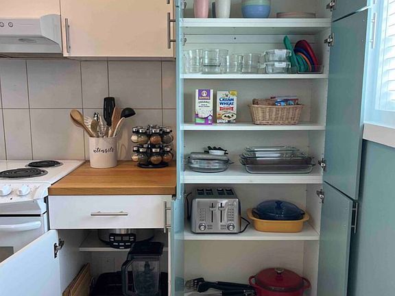 Kitchen: This cheerful, well-lit, open-concept kitchen has table seating for four. It is fully stocked with dishes, pots, pans, and spices for your convenience. There are full-sized appliances, a dishwasher, and common small appliances.