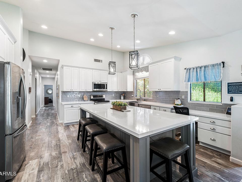 Nestled in the vibrant heart of Gilbert, AZ, this exquisite 4-bedroom, 2-bathroom residence combines modern luxury with cozy charm.As you approach, the elegant stone detail on the front facade sets the tone for the quality and style that awaits inside. Step through the inviting entrance into a bright and airy living space, enhanced by upgraded plank flooring throughout and double sliders that flood the home with natural light.The gourmet kitchen is a chef's paradise, featuring stunning quartz countertops, a large island perfect for entertaining, and top-of-the-line stainless steel appliances. The farmhouse sink and 42' cabinets add a touch of rustic elegance, while the electric fireplace with shiplap surround and mantel in the living area creates a warm and welcoming ambiance. Both bathrooms have been thoughtfully updated, boasting double sinks and luxurious finishes. The master suite offers a private retreat with all the amenities you desire.Outside, the large yard is a tropical paradise with mature landscaping and lush grass, providing a serene backdrop for outdoor activities. Enjoy the Arizona sunshine on the covered flagstone patio or the paver patio in the backyard. There's also a shed for extra storage and an RV gate with parking.Practical upgrades include new ceiling fans and lights, a new garage door and opener, built-in cabinets in the garage and laundry room, and a modern sprinkler control panel.Don't miss the opportunity to make this beautiful home yours!