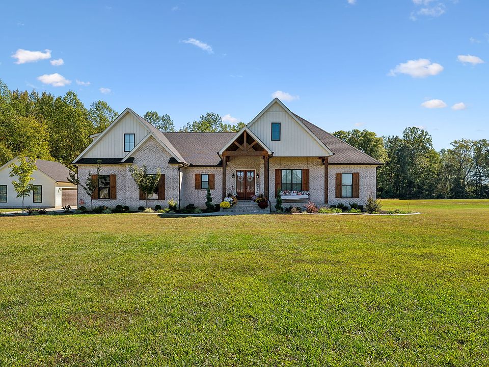 Welcome to your dream home! This custom all-brick residence completed in 2020, is situated on a corner lot spanning 3.5 acres. As you enter, you're greeted by a shiplap entry foyer and laminate floors throughout. Heart of the home boasts a cozy stone fireplace with built-ins while the dining room showcases board and batten accents. Kitchen features custom cabinetry, tiled backsplash and island with bar seating. This home offers mainly one-level living with three bedrooms, three full bathrooms, one half bath, and a flex room that an easily be used was another bedroom, all conveniently located downstairs. Each bedroom is complemented by walk-in closets and luxurious bathrooms featuring walk-in tiled showers. Primary suite boasts a spacious closet that conveniently leads to the laundry room. Upstairs, you’ll find a bonus room with a half bath ideal for guests or a private office. Enjoy the serene views from the covered front porch or back patio. Two-car attached and two-car detached garage! Just 30 mins from M'Boro! 1% closing cost credit of loan amount with Suggested Lender!