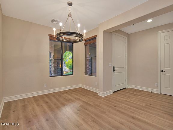 Welcome to this stunning, move-in ready home in the highly desirable Prescott Lakes community--a Firewise neighborhood known for its beauty, and exceptional amenities. This meticulously maintained residence combines modern upgrades, timeless design, and thoughtful functionality, offering the perfect blend of comfort and sophistication.Step inside to discover a light, bright, and open great room that seamlessly connects to the remodeled chef's kitchen. Expansive view windows fill the space with natural light, creating a warm and inviting atmosphere. The kitchen is a true showpiece, featuring a large island w/ bar seating, new quartz countertops, soft-close cabinetry and drawers, and a pantry with built-in door shelving for optimal organization. The upgraded stainless steel appliance package includes a refrigerator, double oven range, microwave, and dishwasher perfect for both everyday living and entertaining. A stylish subway tile backsplash, under-cabinet LED lighting on a dimmer switch, and a new Kraus double sink with a chef-style faucet complete this dream kitchen.The open-concept layout flows effortlessly into the great room, where top-down, bottom-up window treatments allow for customizable light and privacy. New luxury vinyl plank flooring runs throughout the home--no carpet anywhere--offering durability and easy maintenance. The flexible formal dining room can also serve as a den/flex space/ home office, providing versatility to suit any lifestyle. Ceiling fans in every room, operated by remote or wall switch, ensure year-round comfort.The spacious primary suite is a private retreat, featuring a built-in dresser (with flooring installed underneath for easy removal), a large walk-in closet with natural lighting, built-in shelving, and a security system hub. The primary bath has been beautifully updated with dual sinks, new soft-close cabinetry, quartz countertops, new Kohler faucets with matching hardware, dual medicine cabinets, and elegant new vanity lighting. The walk-in shower includes a built-in storage niche and shelving, combining style and practicality.Guests will appreciate the full guest bath, high-end finishes with soft-close cabinetry, quartz counters, and new Kohler faucets with matching hardware. The large laundry room includes newer stainless steel washer and dryer.Outdoor living is equally impressive. Enjoy extended paver patios in both the front and back, a designer front security screen door, and a large covered rear patio perfect for relaxing or entertaining. The backyard offers exceptional privacy with mature trees. Two natural gas stubs on the rear patio make it easy to add a grill or fire feature. The entire landscape is supported by a two-zone automatic drip irrigation system, ensuring low-maintenance beauty year-round.Additional upgrades include gutters with leaf guards, a side walk-through gate, a newer water heater with recirculating pump and water softener loop, a newer garage door opener with wireless operation, and a recently replaced AC condenser motor (only one year old). Every detail has been carefully considered to provide comfort, efficiency, and peace of mind.Located in the prestigious Prescott Lakes community, residents enjoy access to world-class amenities including a private golf course, clubhouse, fitness center, tennis and pickleball courts, indoor and outdoor pools, and scenic walking trails. The community's Firewise designation adds an extra layer of safety and environmental care, making it one of Prescott's most desirable neighborhoods.This exceptional home truly has it all--modern upgrades, thoughtful design, and a prime location in one of Prescott's most sought-after communities.