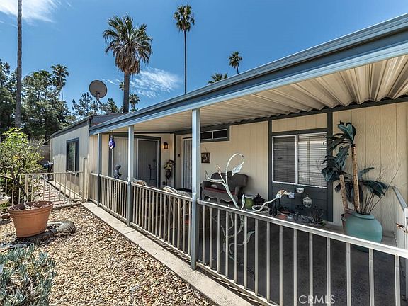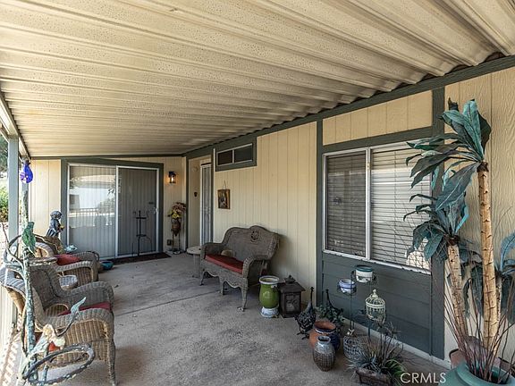 Nicely upgraded triple wide mobile home in a beautiful 55+ gated community in Corona. Cute front porch, carport for parking up to 3 cars, and large storage shed. 2 bedrooms, 2 bathrooms, including a large primary suite with walk in closet, soaking tub, additional storage area, and cute patio off the bedroom. You will also find a good size kitchen, large family/mud room with lots of cabinets, and HUGE family room. 1344 square feet makes this a very comfortable home! Lots of upgrades including newer flooring throughout the kitchen and dining room, new AC unit, new furnace and duct work, and completely drywalled interior for energy efficiency and sound. The community is super clean and includes a pool/spa, card room, game room with multiple pool tables, and a full kitchen and meeting room to hold events/parties.