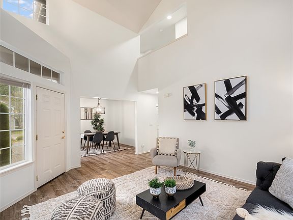 A fantastic opportunity awaits to own this meticulously maintained, move-in ready 3 bed 2.5 bath home that effortlessly combines comfort and style. The covered front patio sets the tone for what lies beyond, leading you into a grand living room with soaring ceilings, abundant natural light pouring in through large windows. Well-equipped kitchen boasts full pantry, ample cabinet and counter space, and convenient bar seating. Formal dining room, adaptable as a home office, adds flexibility. Second living room with a cozy gas fireplace provides a warm and inviting space, complemented by a slider leading to fully landscaped, low-maintenance yard. The large patio is perfect for entertaining and unwinding!