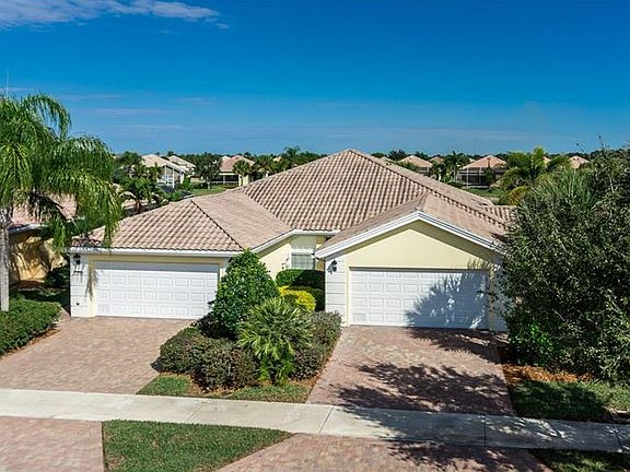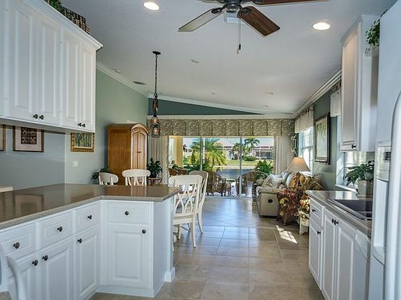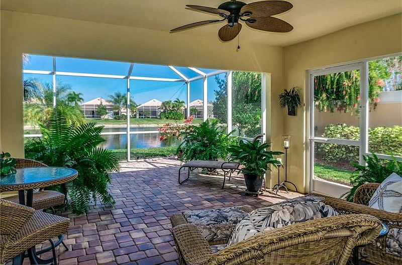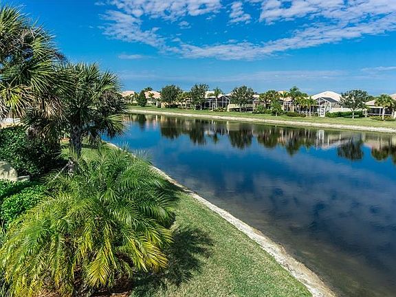 Back on Market...Home Inspector says "perfect"! This IslandWalk beauty has a bright color palette; attractive decorating; porcelain floors in living areas; large master bedroom w/en-suite bath; huge second bedroom suite w/privacy door; open floor plan; and water view from newer extended paver lanai. Solid poured concrete walls and attention to detail, including: recessed lighting; large laundry with sink, 42" cabinets, closet storage, and folding area; central vac; 6 panel doors with Canterbury casing; walk-in Designer closets; lush landscaping; wired alarm system; privacy wall; paver brick driveway and walk; and pull down stairs in garage to large storage area, all proclaim original Divosta quality and now an Up-Charge in new construction. The owners' quality touches include: 20x20 porcelain tile on the diagonal with decorative trim in open den area; designer fans; window treatments; crown molding in EVERY room; epoxied garage floor; overhead storage racks in garage; garage keypad; extended paver lanai; custom cut glass entry door; add'l landscaping; granite composite sink with designer faucet and cabinet knobs to match; designer lights in dining area and entryway; and humidistat. This Villa is truly "drop-dead" gorgeous. Leather sectional and solid wood entertainment center in Living Room ONLY included. (with FULL OFFER Addl Furniture added, see Attchm). Gated Community, Guard 24/7. Amenities include 2 salt water pools, 8 tennis courts, pickle and bocce ball, workout room, two activity centers and more.