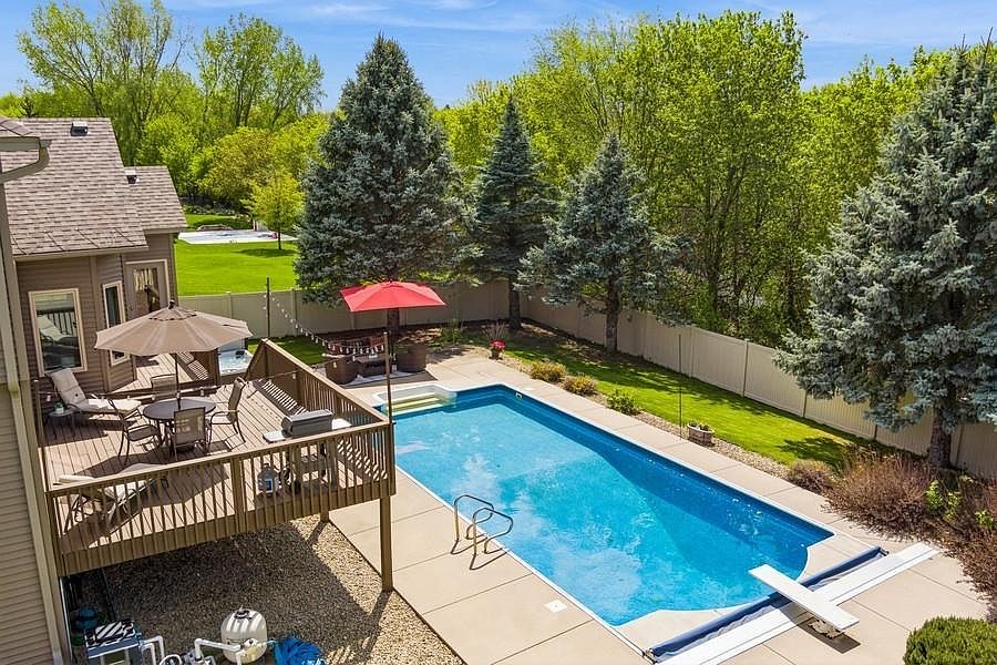 Beautiful Andreen custom built 2 Story featuring refreshing inground pool (36ft x 18ft) in your wooded private backyard oasis. No need for a cabin when you can relax and entertain all summer in your own poolright out your back door. Enjoy summer BBQs on your deck and patio and cool breezes in your 3 Season Porch overlooking the pool. Hot tub is negotiable at new price. Sauna awaits in the lower lvl. Full main-free privacy fence backyard w/mature landscaping + underground irrigation system. Home features: 2015 full remodeled Kitchen w/granite counter tops + ss appliances, wood floors in both Dining Rms/Kitchen, main floor Office/Bedrm + 3/4 Bathrm, updated light fixtures and 10 ft ceilings on much of Main lvl. Main level: Living Rm w/gas fireplace + spacious Informal Dining Rm for entertaining. Lower level: Family Rm w/fireplace and Game Rm both w/9ft high ceilings, 5th Bdrm, ¾ Bathrm, Sauna and lots of storage room. Three car garage w/plenty of strge. Must see outdoor paradise!