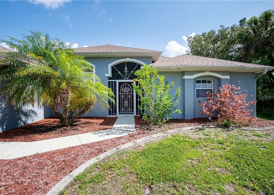 This Port Charlotte home (near to North Port) with soaring ceilings has 3 BR, 2 BA, Living Room, Formal Dining Room, Family Room, Breakfast Room, inside Laundry Room, and a gorgeous Low, Low maintenance heated pool with many jets and lights, which was added in 2013. Easy-Glide sliders lead from the family room, living room and master bedroom to the lanai/pool. Kitchen has extra tall wood cabinets and Corian countertops with an eat-in dining area and breakfast bar and large pantry. Master bedroom has his/hers closets, and master bathroom has two sinks, garden tub, separate shower and separate toilet area. Backyard is oh so private. New water heater in 2019, A/C in 2016 and Culligan water system in 2019. Outside was painted in 2017. Conveniently located to schools, shopping, dining, sports venues, golf, and, of course, Florida's great beaches!
