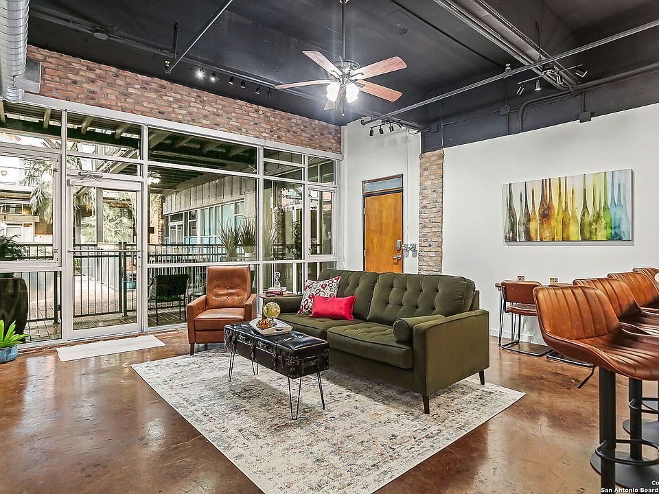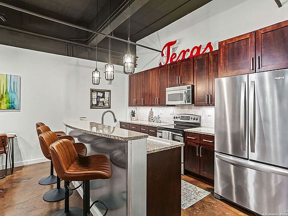 Located in the South End Lofts Condominiums, this first-floor unit offers true Southtown living. Designed with an industrial aesthetic, the space features modern finishes, stainless steel appliances, granite countertops, exposed brick accent walls, and stained concrete floors. Two tandem parking spaces are included. The primary bedroom features high ceilings, large windows that fill the space with natural light, and a walk-in closet. The ensuite bathroom offers a spa-like experience with double vanities, a jetted soaking tub, a separate walk-in shower, and beautifully updated modern mirrors. A private covered, fenced patio just off the living space overlooks a serene courtyard with a beautiful fountain, perfect for quiet mornings or evening relaxation. HOA dues cover water, trash, sewer, pest control, and building management. The community provides 24-hour surveillance and controlled access for added peace of mind. Amenities include a rooftop deck offering panoramic views of the San Antonio skyline, where you can take in city lights and downtown landmarks. A pool with a BBQ area adds to the communal space for entertaining, while the fitness center and small pet park provide convenience for everyday living. Enjoy walkable, connected urban living in the heart of one of San Antonio's most vibrant and artistic districts. Southtown is known for its eclectic mix of historic charm and modern energy, with an array of local restaurants, bars, coffee shops, galleries, and cultural venues all just steps away. Whether you're exploring First Friday art walks, dining at chef-driven eateries, or enjoying the nearby River Walk, King William Historic District, or Blue Star Arts Complex, this location blends lifestyle and location seamlessly. With close proximity to downtown, The Pearl, and major military bases, this home offers unmatched access to the best of city living.