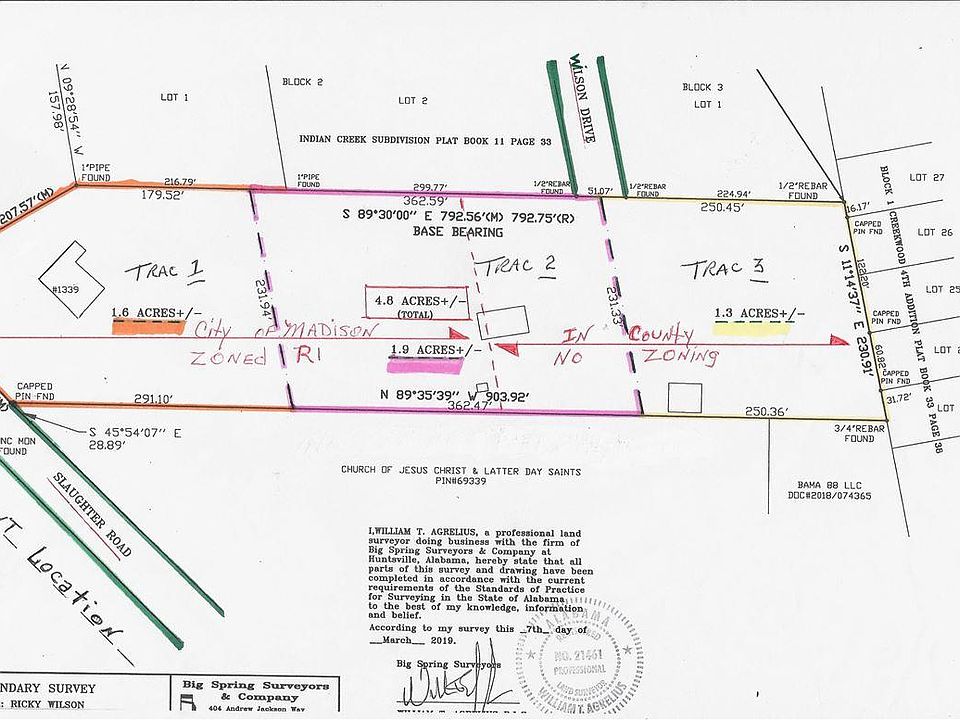 Auction will be held on-site Sat. June 8th @ 10am. Estate,4.8 acres +/- offered in 3 tracts. Tract #1: Has 164 feet fronting Slaughter Rd. Large 3/4 bedroom, 2 bathroom brick ranch style home 1932 sq ft +/-. Approx. 1.6 acres +/- of land on this tract with outbuilding, carport, patio and well water. This tract of land is in the City of Madison. Zoned R-1. Tract #2: 1.9 acres +/- of land with 2 story home approx. 2800 sq ft +/-. Can access property off Mingo rd & Wilson Drive. This tract of land has front portion of lot in City of Madison, zoned R-1. Back portion is located in county, no zoning. Tract #3: 1.3 ares +/- of land. This tract is located in county, no zoning.