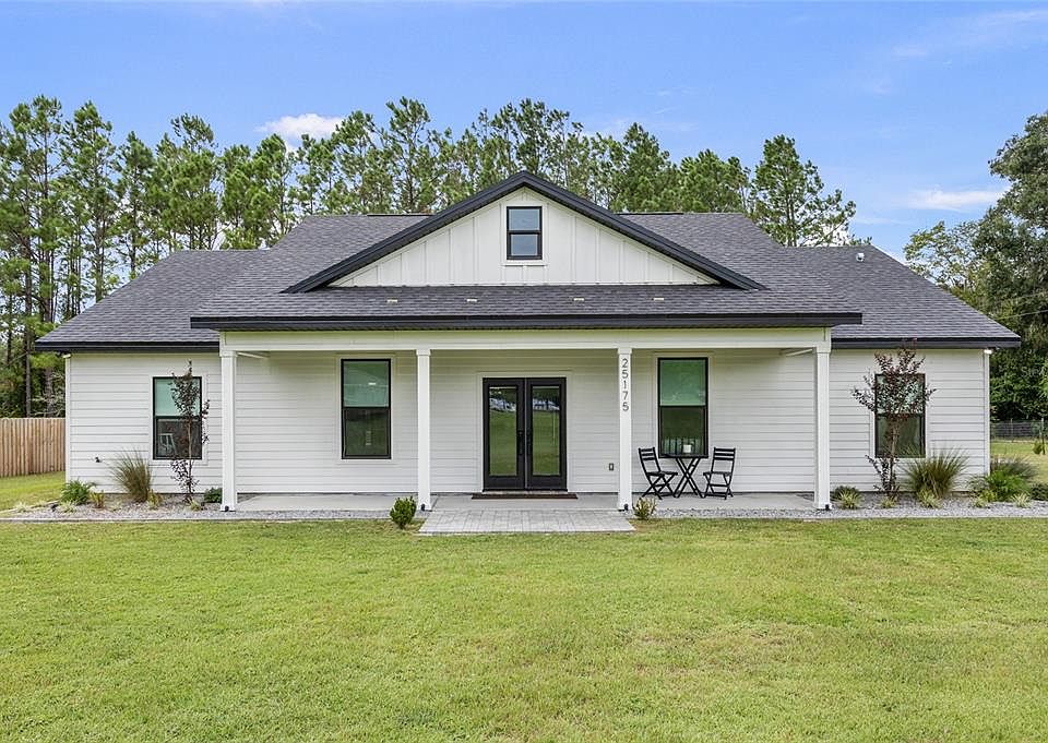 NO HOA or DEED RESTRICTIONS & BETTER THAN NEW 3 bed 2 bath home set off the highway on just under a half acre lot conveniently located between High Springs and Newberry. The open floor plan features exquisite lighting and bath finishes, 10' ceilings in living area and 9' ceilings throughout rest of home, large 2-car garage, quartz countertops, white shaker cabinets, luxury vinyl plank flooring throughout, trey ceiling in the master & more! The luxury master boasts a HUGE walk-in closet, dual vanities, separate shower and freestanding soaking tub. The screened lanai overlooks the fenced backyard which borders a large tree farm.